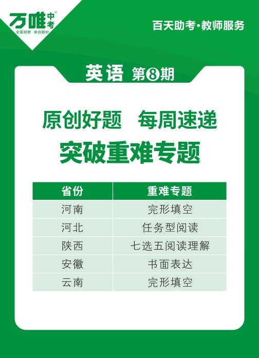 為使師生在中考前更加精準、高效地備考,3月15日—6月9日期間,萬唯中考持續為河南、河北、陜西、安徽、云南5省區初三師生推送七科原創好題等資料,截至目前,已有超3萬名老師每周通過所在的微信群獲取。