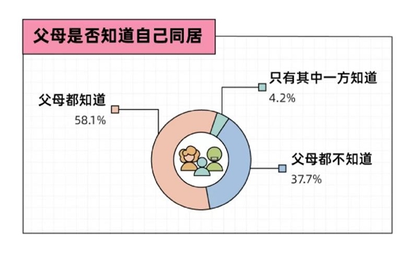 尤其值得注意的是,根據《報告》,37.7%的年輕人壓根就沒讓父母知道自己已經同居,還有4.2%的受訪者表示只讓父母中的一方知道情況。畢竟,父母對待同居的態度相對保守,尤其是女方,《報告》顯示僅有約三分之一的父母支持女生同居。