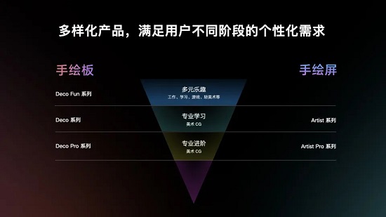 目前,XPPen 共有 2 大品類,5 大系列產品,包括數位板類的 Deco Fun、Deco、Deco Pro 系列及數位屏類 Artist、Artist Pro 系列產品。其中,Deco Fun 產品線系列面向多元樂趣用戶;Deco 和 Artist 產品線系列面向專業學習用戶;Deco Pro 和 Artist Pro 產品線系列面向專業進階用戶。全新的產品布局,可針對不同成長階段的用戶需求,打造從興趣入門到專業學習再到專業進階的產品矩陣。