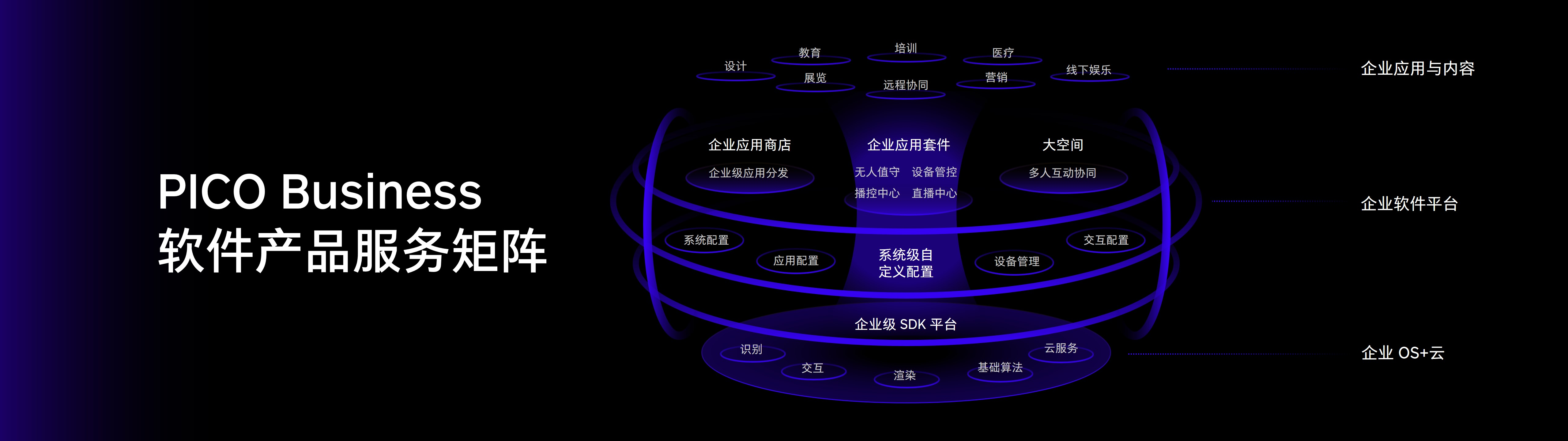 PICO Business是PICO旗下企業(yè)服務(wù)品牌,具備企業(yè)級硬件、企業(yè)級OS、企業(yè)級軟件平臺和企業(yè)級服務(wù)等能力,能為企業(yè)用戶提供全面、成熟的XR解決方案與最佳實踐,幫助用戶提升業(yè)務(wù)效率,降低部署的成本和門檻,解決業(yè)務(wù)中面臨的技術(shù)挑戰(zhàn),創(chuàng)造全新價值。截止目前,全球已經(jīng)有超過4000家企業(yè)客戶與PICO Business合作,面向教育、培訓、醫(yī)療、營銷、展覽、線下娛樂、3D設(shè)計協(xié)作、遠程協(xié)同等場景輸出了軟硬件一體的解決方案,幫助企業(yè)降本增效、提升競爭力。
