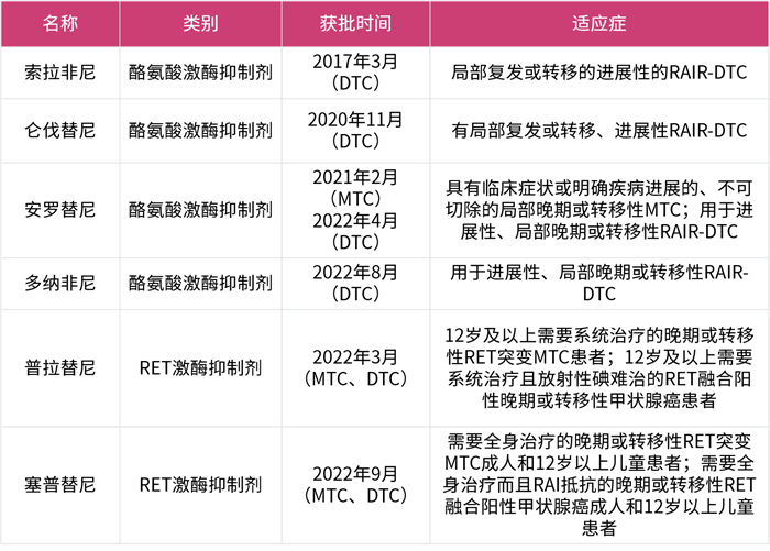 目前,已有多種靶向藥物在國內(nèi)獲批用于治療晚期甲狀腺癌: