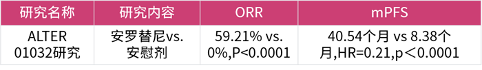 ALTER 01031的Ⅱ期隨機對照研究的結(jié)果表明,對比安慰劑,安羅替尼組的客觀緩解率(ORR)達到48.39%,可以顯著延長中位無進展生存期(mPFS)達9.6個月(20.7個月 vs. 11.1個月)[8],為晚期MTC患者帶來顯著的PFS及ORR獲益,并且安全性良好。安羅替尼甲狀腺髓樣癌適應癥的獲批,打破了國內(nèi)甲狀腺髓樣癌無靶向藥可用的局面,給患者帶來新希望。