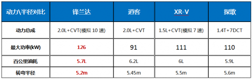 綜合幾款車的動力參數對比,可以發現在賬面數據上,鋒蘭達的動力表現明顯更有優勢,得益于這款2.0L發動機的排量優勢,其最大功率達到126kW,不管是與探歌的1.4T發動機,還是排量相同的逍客2.0L發動機,鋒蘭達都有著明顯的動力優勢。
