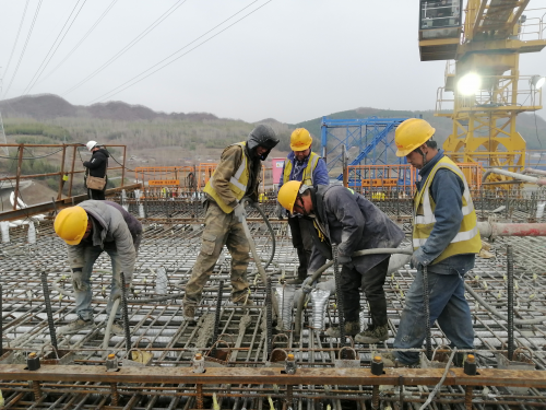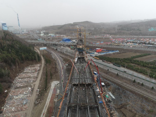 圖為沈白高鐵建設中的白山渾江特大橋,該橋是全線控制性工程,全橋長1499.5米,全橋共有鉆孔樁588根,橋墩臺56個,大跨度連續梁3個,道岔連續梁1個,正在澆筑混凝土的是道岔連續梁和10號墩0#塊。該橋先后跨越渾江、輝臨高速公路及G201國道,涉臨近鐵路既有線施工,安全風險高,施工難點多。