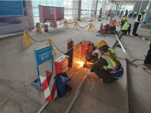 隨著一聲哨響,比賽正式開始,四個比賽項目的參賽隊員迅速行動、各亮絕活,在同等條件下進行工效、工藝、操作規程等多方面比拼。在砌筑比賽中,選手根據規則,通過識圖、排版放樣、測量、勾縫、清潔等步驟,完成最終作品,整個過程一氣呵成;在支架焊接比賽中,“悍將們”一手拿防護面罩,一手持電焊槍,仔細打磨、配對、焊接,完成比賽項目;在支撐架搭設比賽中,選手們安全帽、防滑鞋佩戴整齊,安全帶系掛牢靠,嚴格遵守安全規范要求,每一個步驟都安全有序……整個比賽現場一片忙而不亂的景象,再現了建筑工地日常忙碌的施工場景。