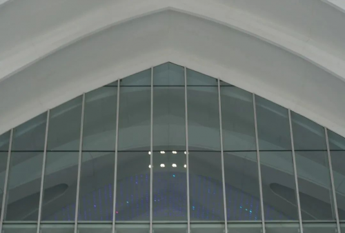登錄廳“鳥喙”造型凈高34m,頂端懸挑長度達到6m。梁柱縱橫交錯、網狀交織。八局裝飾采用裝配式設計施工方法,現場組裝、單元吊裝、多條安裝線流水施工,完成1400塊雙曲異形超長鋁板快速安裝,輔以9953盞Dmax-512系統RGBW調光燈,營造流光溢彩的視覺效果,讓建筑空間更具藝術特性。