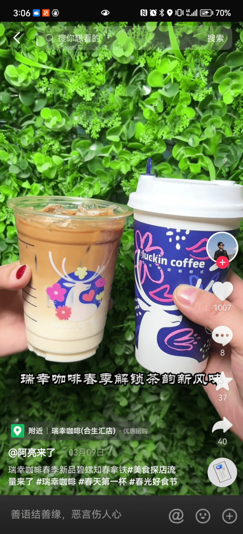 咖啡品類更是春日營銷的主力軍,3 月 6 日,瑞幸官宣新品「碧螺知春拿鐵」,新品與被譽為「鄉村超模」的陸仙人合作。在新品推介過程中,瑞幸不僅將直播間搬到了生茶園,打造沉浸式的直播體驗,讓用戶在觀看直播享受“寵粉式”福利的同時,感受到濃濃的春日氛圍感。不僅如此,瑞幸邀約了一萬名LV3以上的短視頻達人,借助帶貨達人力量為瑞幸茶咖季種草引流,引發站內視頻投稿數4.7萬條。同期,瑞幸咖啡篩選了33位直播達人,在多城市開展了“瑞幸茶咖季”為主題的系列達人直播,通過直播達人承接品牌官方自播熱度和流量。「春光好食節」營銷節點中,通過短視頻種草、官方直播及達人直播,以一系列別具一格的“茶咖大秀”實現破圈層營銷,迅速完成種草全網,最終獲得破億的支付GMV。