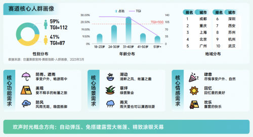 帳篷賽道解讀:該賽道抖音2022年搜索量同比增長228.6%,遠高于行業整體水平。該賽道的興趣群體以 31-40 歲的男性為主,主要分布地區涵蓋多個熱門旅游城市。隨著生活水平的提高和對自然休閑需求的增加,多功能帳篷在未來將更受歡迎,防雨、美觀和防風等多重特性將滿足人們對于舒適和便利的需求。除此之外,在技術創新、多樣化產品、個性化定制、環保可持續發展等趨勢上,這一領域將有廣闊的市場前景。
