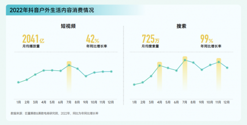2022年戶外生活相關內容在抖音上的受歡迎程度持續增長,月均播放量高達 2041 億次,同比增長 42%。除短視頻種草外,用戶主動搜索戶外生活內容的意愿也更加強烈,月均搜索量達到 725 萬次,同比增長 99%。