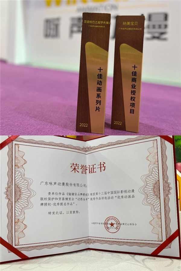? ? 2023年7月20日-7月23日,第十三屆中國國際影視動漫版權保護和貿易博覽會(簡稱“漫博會”)在東莞舉辦,詠聲動漫以優異表現榮獲三項大獎。其中,豬豬俠X納美寶貝聯名系列榮獲“中國IP Bank獎——十佳商業授權項目”,《百變校巴之超學先鋒1》榮獲“中國IP Bank獎——十佳動畫系列片”。詠聲動漫《豬豬俠品牌授權》則斬獲“動感金羊”優秀動畫品牌授權-優秀提名作品。