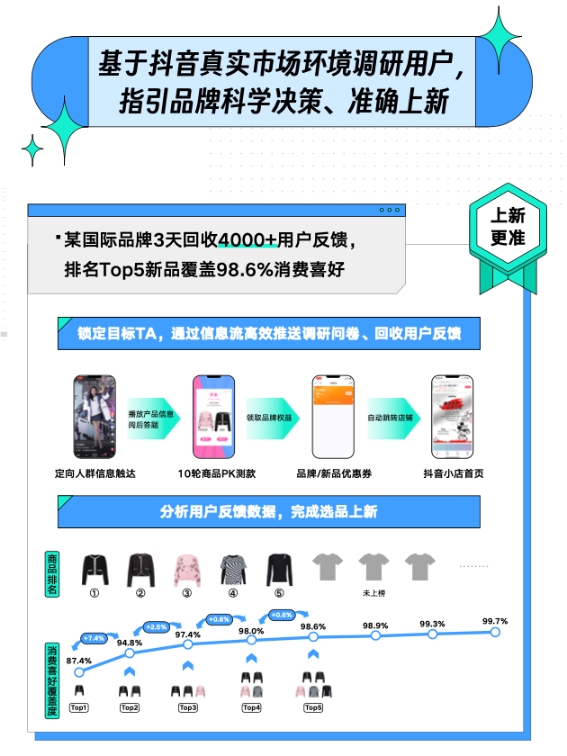 某國際服裝品牌在選品上新時使用巨量云圖“新品實驗室”的測品能力,僅用時三天就回收了超過4000份目標用戶反饋,選出的貨品,也成為后續品牌直播間銷量冠軍,為店鋪GMV的主力貢獻商品。獲得這樣的上新成績是因為巨量云圖在測品的每個細節都試圖降低誤差,從而最大程度還原消費者真實意愿。