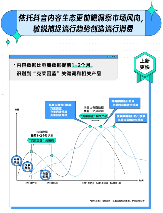 看似無序的消費決策遵循一套基礎邏輯,比如購買普遍發生在瀏覽和搜索之后。所以,內容數據和搜索數據可以被視為交易的前置指標,它們能夠更早預測未來交易走向。正是基于這一結論,擁有內容場監測能力的巨量云圖能更快識別出新品市場機會,為品牌上新提供參考。