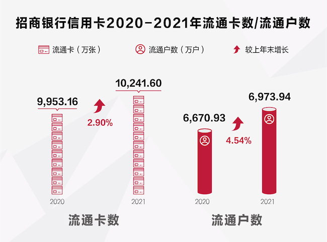 據財報,截至2021年底,招行信用卡流通卡量10241.6萬張,較上年末增長2.9%,首次突破1億張;流通戶數6973.94萬戶,較上年末增長4.54%。招行信用卡流通卡量、流通戶數在高位穩步增長,與其從客戶視角出發推動產品升級,完善豐富的產品矩陣不無關系。