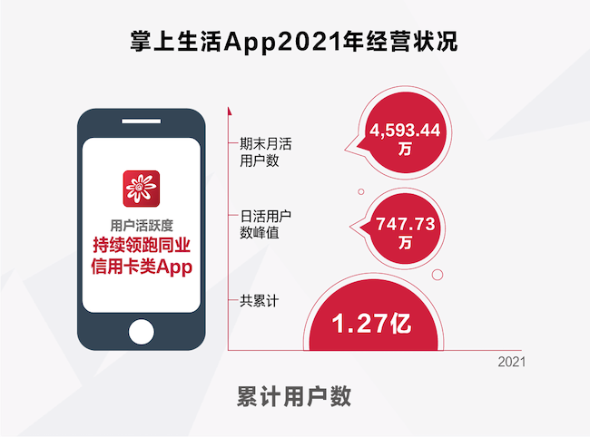 掌上生活App的這些舉措帶來了更高的數字化獲客水平和用戶增長空間,為優化用戶體驗、增強用戶黏性提供了有效路徑。截至2021年底,掌上生活App累計用戶數1.27億戶,日活躍用戶數峰值747.73萬戶,期末月活躍用戶數4593.44萬戶,用戶活躍度居同業信用卡類App前列。