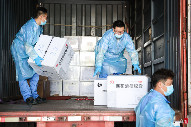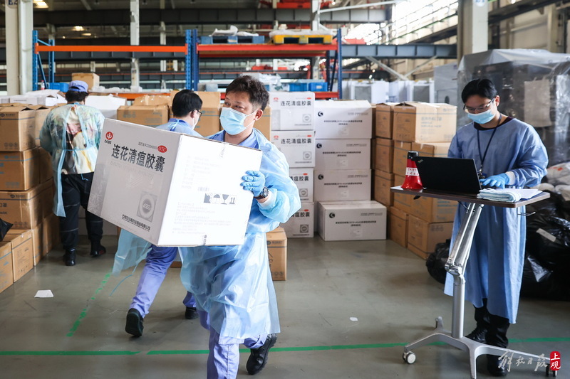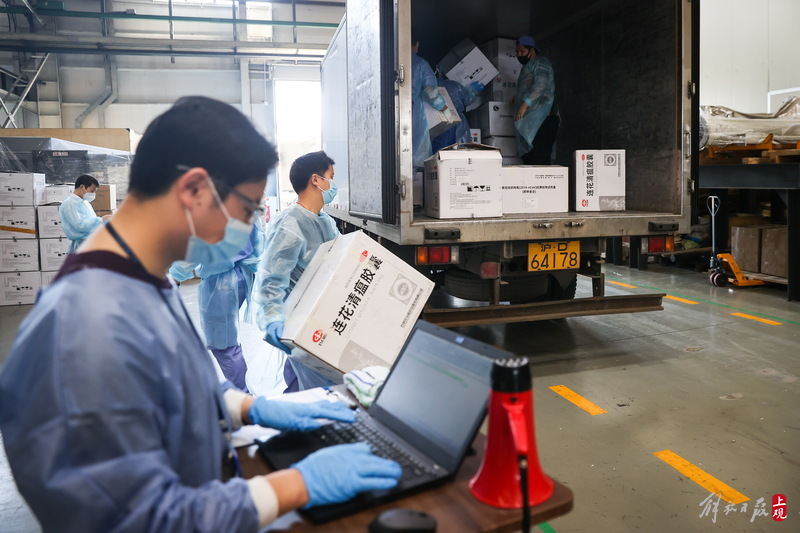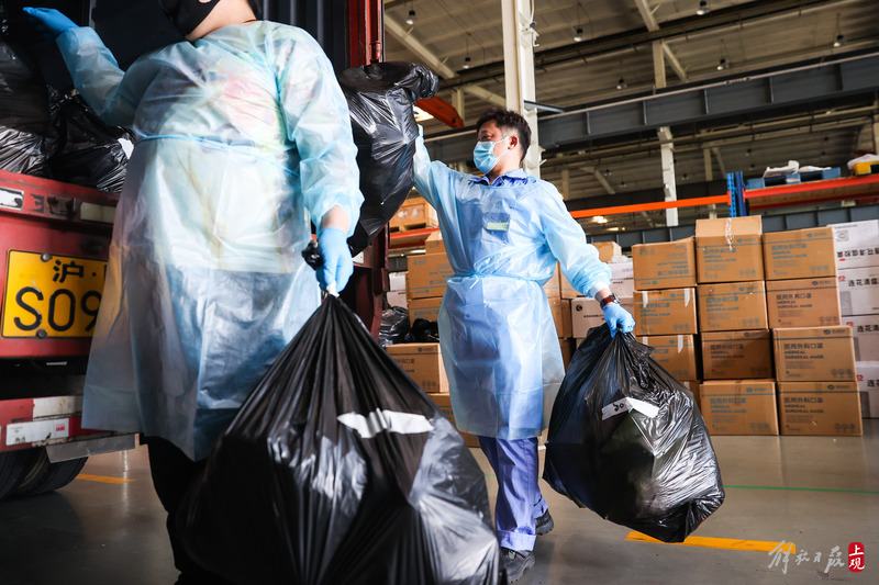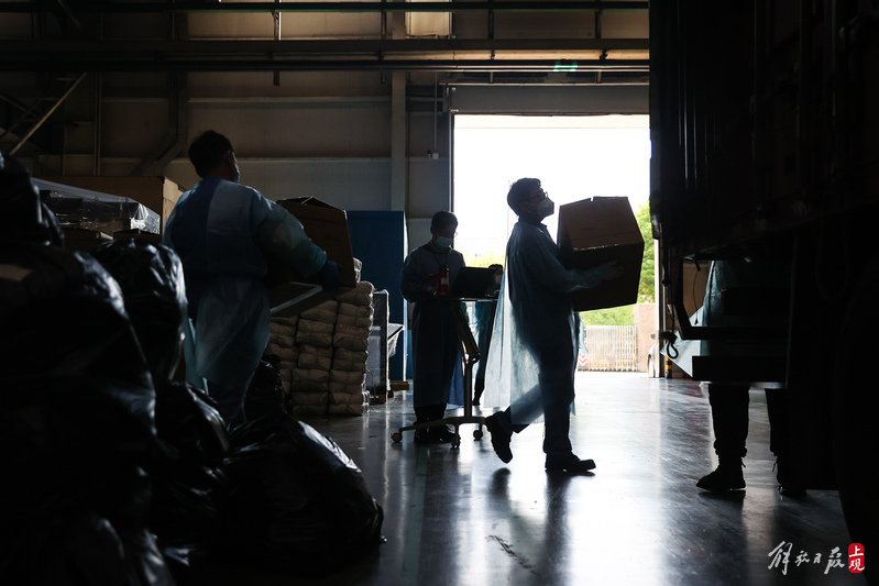 為不增加基層負(fù)擔(dān),寶山區(qū)啟用7個(gè)分揀點(diǎn)對(duì)應(yīng)13個(gè)街鎮(zhèn)園區(qū),由招募來(lái)的企業(yè)職工及志愿者流水線作業(yè),對(duì)物資開展卸貨、分裝。