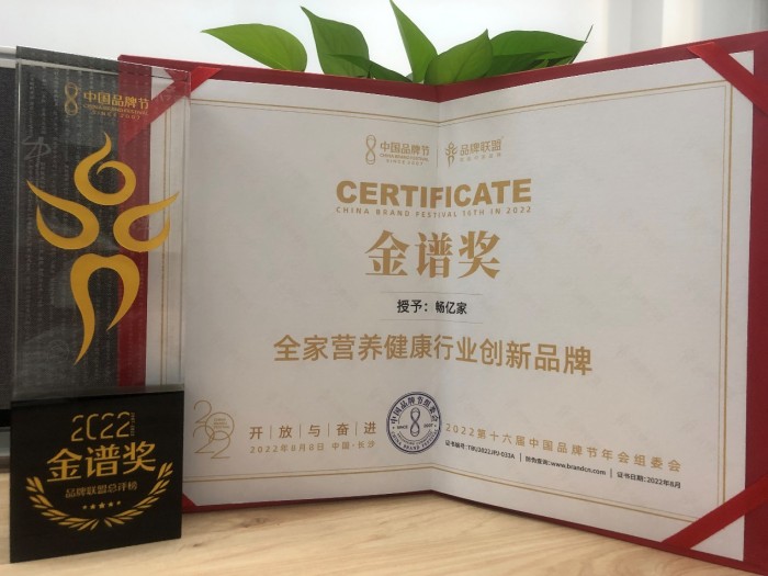 暢億家榮獲“2022中國金譜獎全家營養健康行業創新品牌”