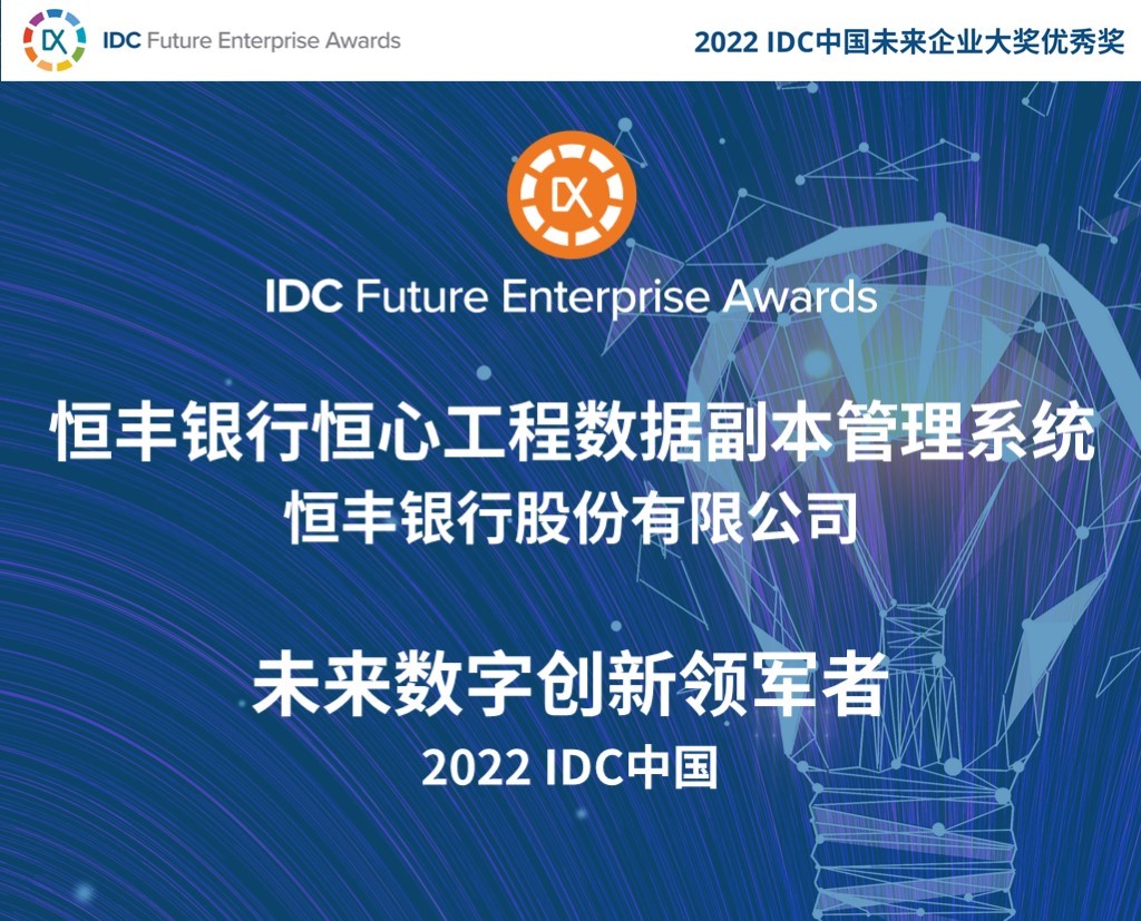 9月1日,IDC中國正式發(fā)布2022IDC中國未來企業(yè)大獎(jiǎng)優(yōu)秀案例獲獎(jiǎng)名單,恒豐銀行憑借恒心工程數(shù)據(jù)副本管理系統(tǒng)項(xiàng)目獲評“未來數(shù)字創(chuàng)新領(lǐng)軍者”優(yōu)秀獎(jiǎng)。