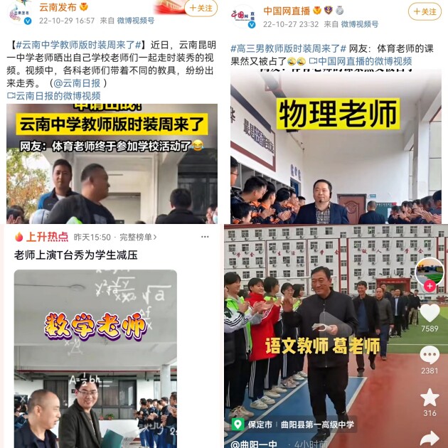 記者了解到,由于受疫情影響,不少學校采取了封控措施,為了豐富校園生活,減緩壓力,一些老師突發奇想,在校園中開展“時裝走秀”活動,并將視頻上傳至微信、微博、抖音等社交平臺,收獲了廣泛好評。之后,各地學校紛紛模仿,尤其是許多初高中任課老師“申請出戰”,希望通過展現自己的“另一面”, 讓那些背負升學壓力的同學們的緊張情緒得到有效釋放。