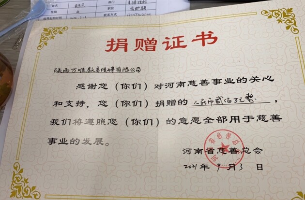 (圖為河南省慈善總會(huì)頒發(fā)的捐贈(zèng)證書)