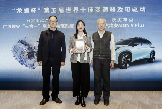 電動汽車電驅動系統全產業鏈技術創新戰略聯盟理事長貢俊(左1)與清華大學車輛與運載學院教授宋健(右1)為廣汽埃安品牌傳播部公關經理潘昱(中)頒獎