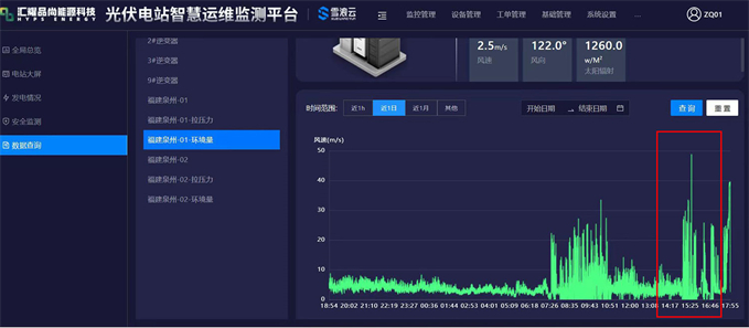在整個臺風過程中,匯耀品尚能源科技光伏電站智慧運維監測平臺起到了重要作用,對環境風速變化、系統監測狀態,及時提供了實時數據。